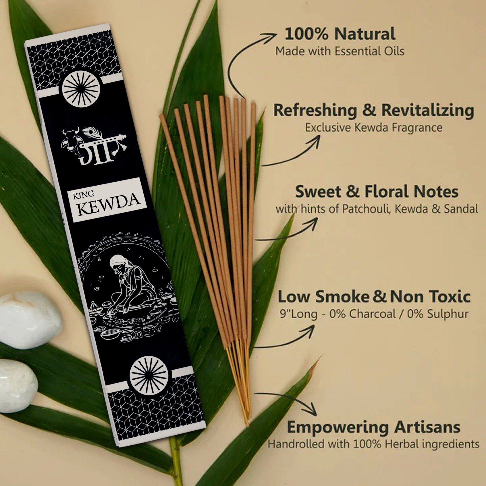 Indulge in the majestic and refreshing aroma of King Kewda, a premium incense stick crafted to uplift your surroundings with a rich floral fragrance inspired by the exotic Kewda (Pandanus) flower.